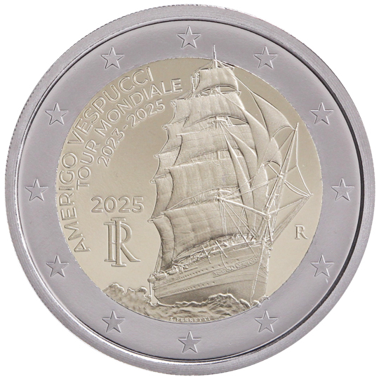 Description: The design shows, in the center, a depiction of the Amerigo Vespucci Training Ship which, at full sail, plows the sea waves. In arch on the left, the writing ‘Amerigo Vespucci Tour Mondiale 2023-2025’; below on the left, ‘2025’, year of the coin issuance and ‘RI’, acronym of the Italian Republic; on the right, ‘R’, identifying the Mint of Rome; in exergue ‘E.FERRETTI’, signature of the designer. The coin’s outer ring bears the 12 stars of the European flag.