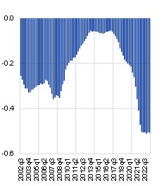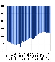 Chart 1 shows the time-varying peak responses of real gross domestic product (GDP), inflation measured through the Harmonised Index of Consumer Prices (HICP) and inflation expectations to a standard monetary policy shock normalised to +25 basis points. Such a shock is defined as an unexpected one-off increase in the interest rate at each point in time. Our model-based estimates show a pronounced strengthening of the inflation response to an interest rate hike over the period 2022-23, alongside a lower than usual response in terms of real activity.[3] A main driver of this result is how people’s expectations about future inflation behave. Even as inflation rose sharply from mid-2021, expectations remained firmly anchored. As monetary tightening accelerated from mid-2022 onwards, our analysis shows that there was a substantially stronger reaction in terms of inflation expectations than in earlier periods. This reinforced the disinflationary effects of the policy.