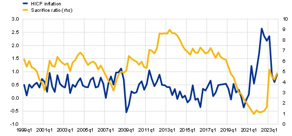 Notes: The sacrifice ratio is computed as the sum of output-gap deviations divided by the sum of inflation deviations over 20 quarters in response to a +0.25% unexpected monetary policy shock on the quarterly policy rate. HICP inflation expressed in quarterly growth rates.