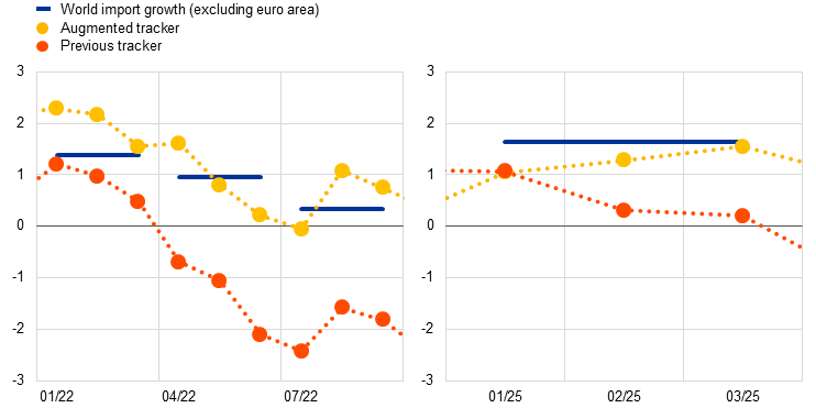 The augmented tracker particularly outperforms the previous tracker in periods when financial market variables diverge from global trade dynamics. Global trade is generally well-correlated with financial market movements (Barhoumi and Ferrara, 2015), but this relationship can lead to erroneous signals when financial markets widely decouple from trade dynamics. This occurred in 2022, when stock markets fell amid surging inflation and geopolitical shocks while global trade was resilient due to the gradual easing of supply bottlenecks (Chart C, panel a). A similar situation arose in the first quarter of 2025, when financial markets retreated due to policy uncertainty whereas global trade was boosted by a frontloading of imports ahead of tariffs (Chart C, panel b). In both episodes, the previous tracker pointed to global trade growth well below its actual pace, which the augmented tracker captured more accurately.