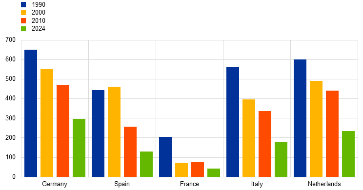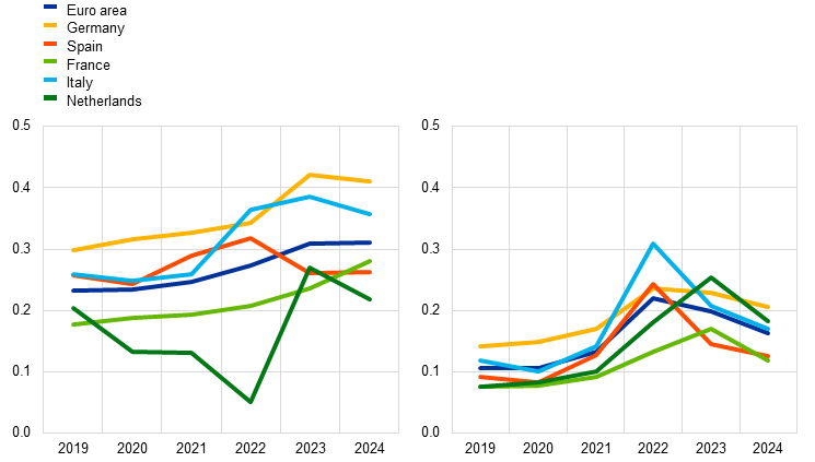 Higher electricity prices have significantly increased total expenditure for both households and energy-intensive industries, despite declining consumption, particularly among energy-intensive industries (Chart C). A decomposition of total electricity expenditure into prices and consumption reveals that the increase in electricity prices has driven the increase in expenditure. Between 2019 and 2023 electricity consumption by energy-intensive industries in the euro area declined by around 14.5%, while household electricity consumption fell by around 1.5%.[5]