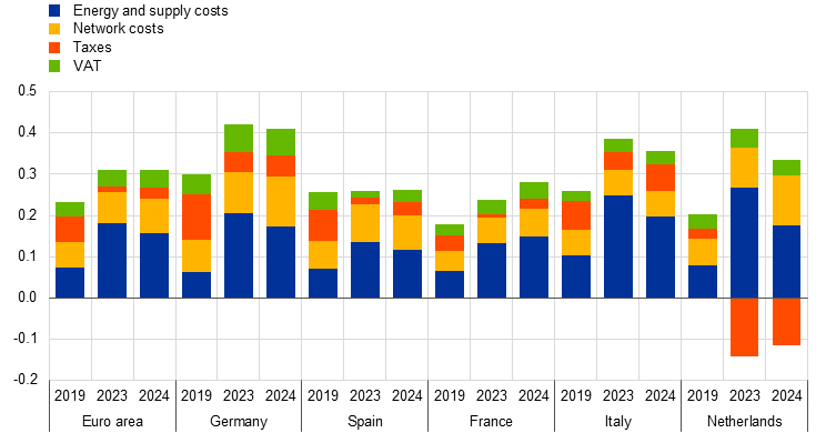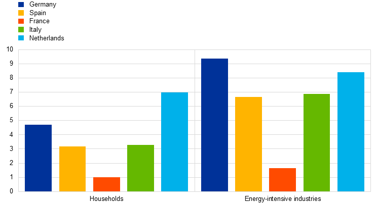 Euro area households pay around twice as much for electricity as energy-intensive industries, reflecting higher prices across all components of the electricity bill (Chart B). In France and the Netherlands, households pay approximately 64% and 20% more than energy-intensive industries. This is even more pronounced in Germany, Spain and Italy, where household electricity prices are around 100% higher. Countries that rely on imported fossil fuels for electricity generation tend to face higher electricity prices, since these are typically more expensive at the margin than nuclear or renewables. Additionally, differences in national taxes and regulation on network charges also account for considerable cross-country variation in final electricity prices.[3]