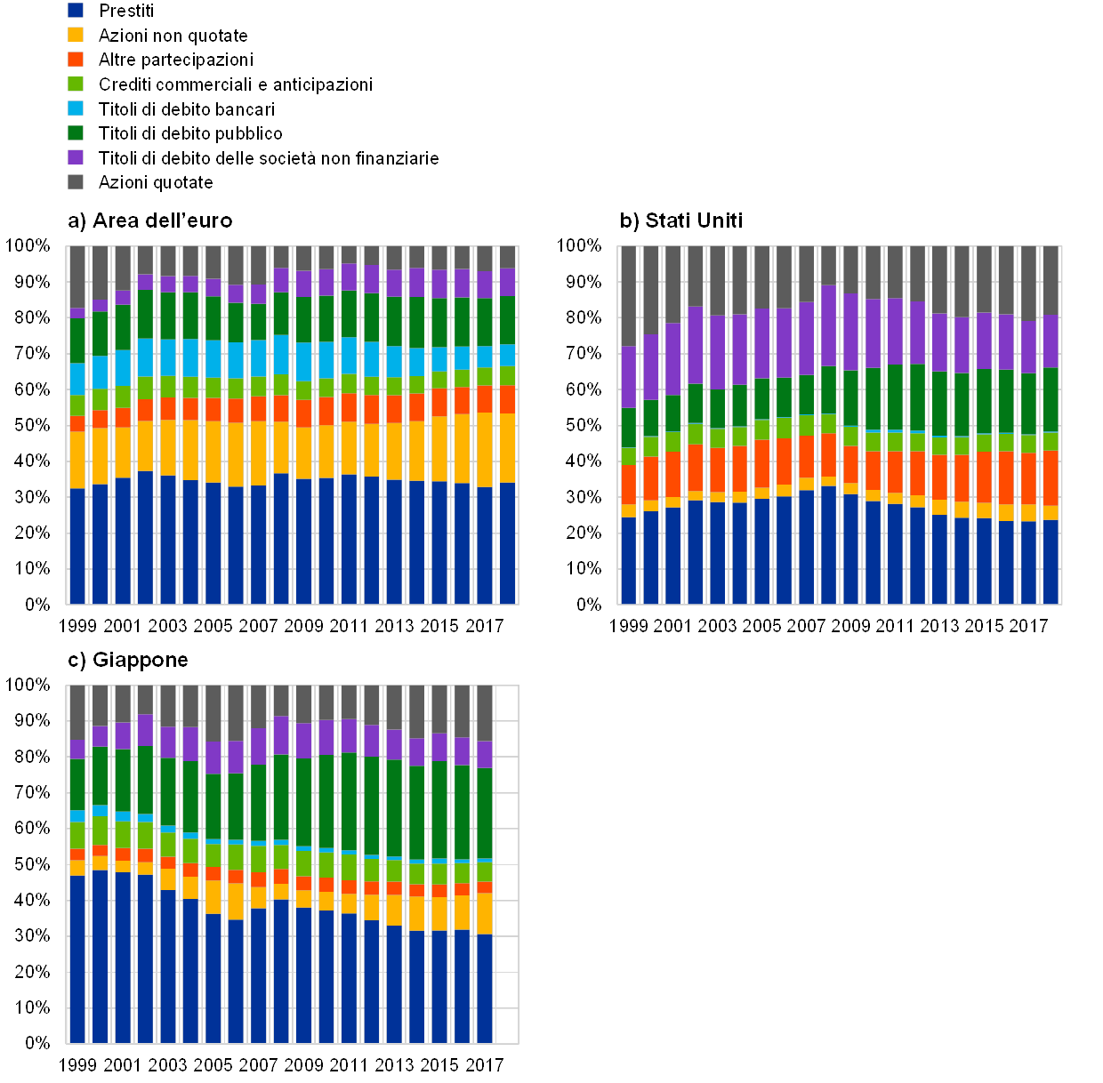 Fonti: BCE per l’area dell’euro e OCSE per gli Stati Uniti e il Giappone.Note: il grafico è costruito sulla scorta delle passività di tutti i settori economici, esclusi le passività verso il resto del mondo, i prestiti delle SNF (per sottrarre i prestiti infragruppo da questi dati non consolidati), il circolante e i depositi, le quote di fondi di investimento, i diritti pensionistici, le assicurazioni e le garanzie standard, gli strumenti finanziari derivati e le stock option conferite ai dipendenti, nonché gli altri conti passivi. Le altre partecipazioni si riferiscono a forme di capitale di rischio non rappresentate da azioni quotate nei mercati regolamentati e azioni non quotate, come le quote nelle società in accomandita, le quote nelle società a responsabilità limitata i cui proprietari sono soci, le partecipazioni al capitale di cooperative, le partecipazioni delle amministrazioni pubbliche al capitale delle società pubbliche che non è suddiviso in azioni. I dati relativi agli Stati Uniti e al Giappone si basano sul Sistema dei conti nazionali (SCN) 2008, applicato a livello mondiale. Il Sistema europeo dei conti (SEC) 2010, sul quale si basano i dati relativi all’area dell’euro, è sostanzialmente in linea con l’SCN 2008, anche se in alcuni casi potrebbe essere più dettagliato.
