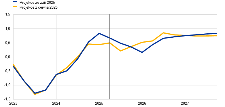 Výhled inflace odpovídá tomu, že se inflace stabilizuje poblíž 2% střednědobého cíle. Celková inflace, měřená harmonizovaným indexem spotřebitelských cen (HICP), by měla po zbytek roku 2025 kolísat poblíž 2 %, v roce 2026 klesnout na 1,7 % a následně se v roce 2027 zotavit na úroveň 1,9 %. Pokles v roce 2026 odráží další postupné snižování cen neenergetických složek, zatímco růst cen energií by měl zůstat volatilní, ale v horizontu projekcí by měl zesílit, částečně v důsledku spuštění systému EU pro obchodování s emisemi ETS2 v roce 2027. Očekává se, že ceny potravin zpočátku i nadále porostou rychleji, neboť se projeví zpožděné dopady dřívějšího růstu cen mezinárodních potravinářských komodit. V letech 2026 a 2027 by však růst měl zmírnit na úroveň mírně nad 2 %. Inflace měřená HICP bez započtení energií a potravin (HICPX) by měla klesat s tím, jak poleví mzdové tlaky a zmírní se růst cen služeb a jak se posilování eura projeví v cenovém řetězci a omezí růst cen zboží. Očekává se, že nižší růst mezd vyplývající z již realizované kompenzace ztrát reálných mezd v minulosti a oživení růstu produktivity povedou k výrazně pomalejšímu růstu jednotkových mzdových nákladů. V porovnání s projekcemi z června 2025 byl výhled celkové inflace měřené HICP revidován pro rok 2025 i 2026 o 0,1 procentního bodu směrem nahoru. Důvodem jsou vyšší aktuální údaje o cenách energetických komodit i předpoklady o jejich budoucím vývoji a také zpožděné účinky vyšších mezinárodních cen potravinářských komodit, které převažují nad posílením eura. Očekává se, že v roce 2027 budou převládat zpožděné účinky posilování eura, což povede k revizi o 0,1 procentního bodu směrem dolů.
