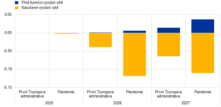 Makroekonomické dopady na eurozónu jsou v případě první alternativní trajektorie minimální, ale výrazné v rámci druhé alternativní trajektorie s extrémnějšími poruchami v dodavatelských řetězcích, stejně jako během pandemie. Zaměříme-li se nejprve na výsledky v případě ekonomiky s plně fungujícími výrobními sítěmi a s využitím modelu ECB-BASE, a to u trajektorie s překážkami v dodávkách podobnými těm během první Trumpovy administrativy, vznikly by pouze minimální inflační tlaky, přičemž inflace měřená HICP by byla v roce 2027 o méně než 0,1 procentního bodu vyšší (graf 20, panel b, modré sloupce). Scénář s podobnými šoky, jaké nastaly během období pandemie, by vedl k výraznějším dopadům na inflaci, přičemž inflace měřená HICP by byla v roce 2027 až o 0,15 procentního bodu vyšší (graf 20, panel b, modré sloupce). V obou citlivostních analýzách je dopad na reálný HDP zanedbatelný nebo mírně kladný a odráží předpoklad nezměněných úrokových sazeb, což při vyšší inflaci implikuje snížení reálných úrokových sazeb, které by hospodářskou aktivitu podpořilo (graf 20, panel a, modré sloupce). Analýza je rozšířena pomocí víceodvětvového modelu pro více zemí, který zohledňuje vstupní a výstupní vazby, přičemž kromě dodavatelských řetězců jsou překážky také ve výrobních sítích. Tento předpoklad snižuje nahraditelnost v rámci výrobních řetězců a vedl by k výraznějším efektům (graf 20, žluté sloupce). V tomto případě by inflace ve srovnání se základním scénářem mohla být v roce 2027 ve scénáři první Trumpovy administrativy až o 0,1 procentního bodu vyšší a v extrémnějším pandemickém scénáři o téměř 0,25 procentního bodu vyšší a růst HDP by byl mírně tlumen.[19]