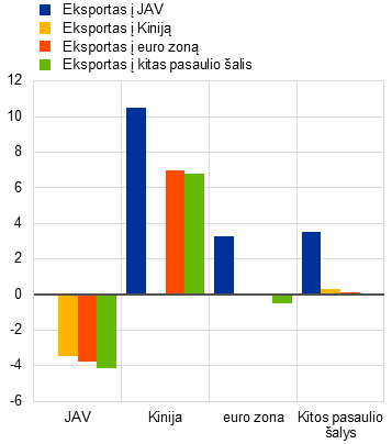 Pastabos: grafike parodyti dvišalės prekybos pokyčiai 2027 m. ketvirtąjį ketvirtį (nesvertiniai). Kinijos valiutos kursas iš dalies valdomas. Kitų pasaulio šalių rodiklis apskaičiuotas kaip paprastas eksporto nuokrypių nuo bazinio lygio vidurkis, vertinant pagal visus į ECB-Global modelį įtrauktus regionus, išskyrus JAV, Kiniją ir euro zoną.