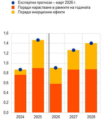 В края на миналата година икономиката на еврозоната отбеляза растеж от 0,2% в съответствие с експертните прогнози от декември. Тя беше подпомогната от засилено потребление и държавни инвестиции. Краткосрочните показатели сочат, че положителната динамика на растежа е продължила през първите два месеца на 2026 г., но войната в Близкия изток доведе до низходяща ревизия на краткосрочната перспектива за него, тъй като сътресението при енергийните цени и засилването на несигурността вероятно ще доведат до отслабване на потреблението и инвестициите. Очаква се това забавяне да бъде временно при условие че енергийните цени спаднат сравнително бързо в съответствие с цените на фючърсните пазари на енергийни суровини, и че несигурността отслабне. В средносрочен план вътрешното търсене би трябвало да запази ролята си на основен двигател на растежа в еврозоната, подпомогнато от устойчивия пазар на труда и държавните разходи за инфраструктура и отбрана, особено в Германия. Във външен план, макар че се очаква прирастът на износа да се засили благодарение на нарастващо външно търсене, еврозоната вероятно ще претърпи по-нататъшна загуба на световен пазарен дял предвид непреодолените проблеми с конкурентоспособността, включително от структурен характер, и независимо от факта, че митата върху износа към Съединените щати са малко по-ниски, отколкото по времето на декемврийските прогнози. В базовата прогноза се предвижда годишен прираст на реалния БВП от 0,9% през 2026 г., 1,3% през 2027 г. и 1,4% през 2028 г. В сравнение с прогнозите от декември 2025 г. прирастът на БВП е ревизиран надолу с 0,3 процентни пункта за 2026 г. и с 0,1 процентни пункта за 2027 г. поради ескалацията на войната в Близкия изток, а за 2028 г. той остава непроменен.