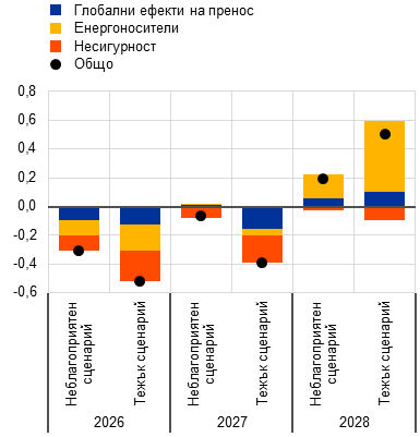При неблагоприятния сценарий се допуска, че въздействието върху икономиката на еврозоната е временно и част от ефекта върху инфлацията отзвучава предвид преходния характер на сътресенията (Графика 14). Тези ефекти се проявяват основно в намаляване на реалния разполагаем доход, дължащо се на по-високите енергийни разходи, по-слабото външно търсене и по-строгите финансови условия, които по канала на VIX засягат инвестиционните решения. Според симулациите чрез модела ECB-BASE растежът на реалния БВП е с около 0,3 процентни пункта по-нисък през 2026 г. и с близо 0,1 процентни пункта – през 2027 г. спрямо базовата прогноза. С нормализирането на цените на енергията и несигурността растежът на БВП възстановява отчасти загубите и през 2028 г. е с 0,2 процентни пункта над базовата прогноза. Енергийният шок е основният фактор за забавянето, което води най-вече до по-ниско потребление. Принос имат и ефектите на пренос в световен мащаб, които затрудняват износа от еврозоната, и несигурността, която ограничава инвестициите. Общата ХИПЦ инфлация е с 0,9 процентни пункта по-висока през 2026 г. поради по-високите цени на енергоносителите. Предвид доста бързия спад на енергийните цени от високите им нива в този сценарий общата ХИПЦ инфлация е с 0,1 процентни пункта по-висока през 2027 г., но с 0,5 процентни пункта по-ниска през 2028 г. поради дезинфлационния натиск от бързото нормализиране на цените на енергоносителите след 2026 г.