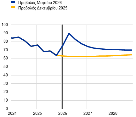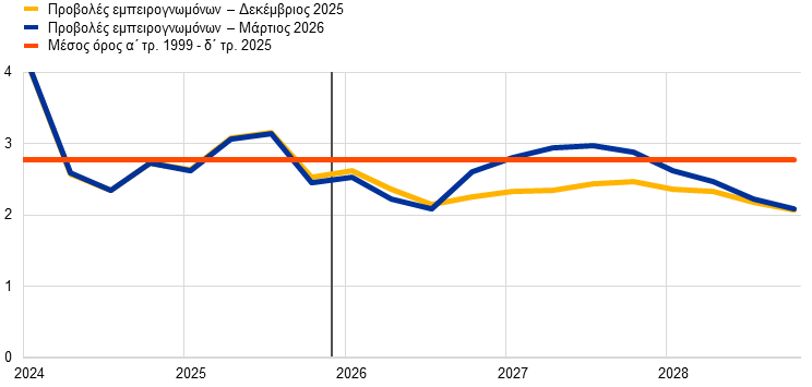 Σημειώσεις: Τα ιστορικά στοιχεία ενδέχεται να διαφέρουν από τις πιο πρόσφατες δημοσιεύσεις της Eurostat. Η κάθετη γραμμή αντιστοιχεί στην έναρξη του τρέχοντος χρονικού ορίζοντα προβολής. Σε αυτό το διάγραμμα δεν παρουσιάζονται διαστήματα αβεβαιότητας γύρω από τις προβολές. Αυτό αντανακλά το γεγονός ότι ο τυπικός υπολογισμός αυτών των διαγραμμάτων (με βάση τα ιστορικά σφάλματα των προβολών), υπό τις παρούσες συνθήκες, δεν θα παρέχει αξιόπιστη ένδειξη της υψηλής αβεβαιότητας που περιβάλλει τις τρέχουσες προβολές. Αντιθέτως, προκειμένου να καταδειχθεί καλύτερα η τρέχουσα αβεβαιότητα, στην Ενότητα 3 παρουσιάζονται εναλλακτικά σενάρια που υποθέτουν διαφορετικούς βαθμούς σοβαρότητας των οικονομικών επιπτώσεων του πολέμου στη Μέση Ανατολή.