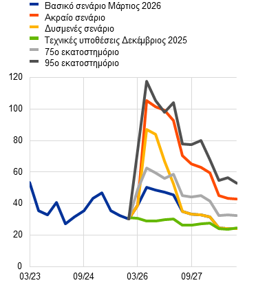 Τέλος, ένα σύνολο προβολών που βασίζονται σε τεχνικές υποθέσεις με τελευταία ημερομηνία συμπερίληψης στοιχείων τις 4 Μαρτίου (που ενσωματώνει πληροφορίες από τις τρεις πρώτες εργάσιμες ημέρες μετά την έναρξη του πολέμου στη Μέση Ανατολή) αντανακλά ευνοϊκότερες προοπτικές, με τις τιμές του πετρελαίου και του φυσικού αερίου να κορυφώνονται, βάσει των υποθέσεων, σε 79 δολάρια ΗΠΑ ανά βαρέλι και 48 ευρώ ανά MWh αντίστοιχα το β΄ τρίμηνο του 2026.[2] Σύμφωνα με αυτές τις προβολές, ο πληθωρισμός θα είναι κατά 0,3 ποσ. μον. χαμηλότερος σε σχέση με το τελικό βασικό σενάριο το 2026 και κατά 0,1 ποσ. μον. χαμηλότερος το 2027 και το 2028, ενώ ο ρυθμός ανάπτυξης θα είναι υψηλότερος κατά 0,1 ποσ. μον. για κάθε έτος του χρονικού ορίζοντα προβολής.