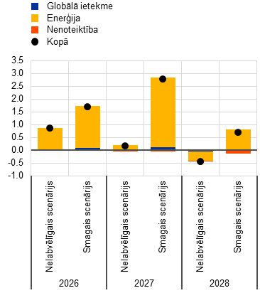 (novirzes no pamatscenārija līmeņa; %; novirzes no pamatscenārija pieauguma tempa; procentu punktos)