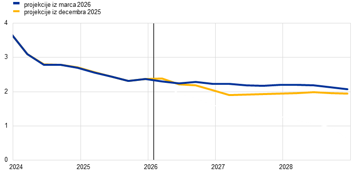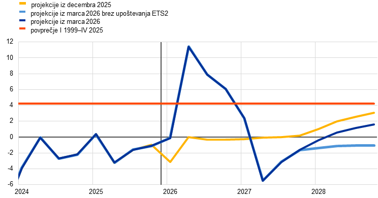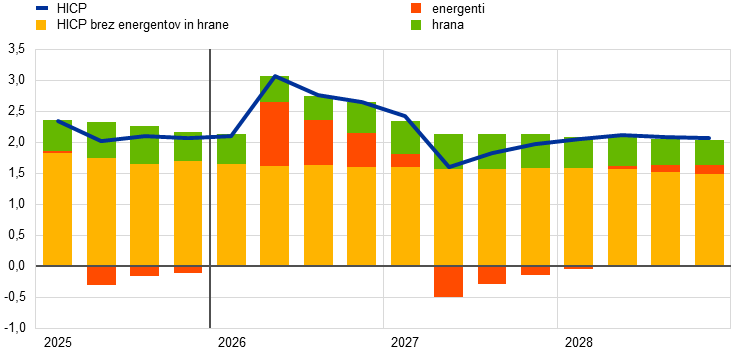 Inflacija, merjena s harmoniziranim indeksom cen življenjskih potrebščin (HICP), se bo v drugem četrtletju 2026 po projekcijah strmo zvišala na 3,1%, k čemur bo prispeval skokovit porast inflacije v skupini energentov zaradi krize na Bližnjem vzhodu, nato pa se bo v tretjem četrtletju znižala na 2,8%, potem ko se bodo znižale cene energetskih surovin, kot izhaja iz terminskih cen. Po osnovnih projekcijah bo inflacija v skupini energentov v letu 2027 postala negativna predvsem zaradi navzdol delujočih baznih učinkov, povezanih z energenti, nato pa se bo v letu 2028 občutno zvišala, ko se bo zaradi uvedbe 2. generacije sistema EU za trgovanje z emisijami (ETS2) skupna inflacija predvidoma zvišala za 0,2 odstotne točke. Inflacija v skupini hrane se bo po projekcijah krepila od konca leta 2026, ko se bodo stroškovni pritiski, ki izhajajo iz skoka cen energentov, prelili v potrošniške cene hrane, nato pa se bo leta 2028 znižala. Inflacija brez energentov in hrane se bo po projekcijah umirila z 2,4% v letu 2025 in bo v letu 2028 znašala 2,1%. Medtem ko na inflacijo brez energentov in hrane vplivajo tudi stroškovni pritiski, ki izhajajo iz višjih cen energentov, naj bi se to ublažilo z določenim popuščanjem pritiskov s strani stroškov dela, preteklo apreciacijo eura in prodorom uvoza iz Kitajske. Gledano v celoti se bo po osnovnih projekcijah inflacija okrepila z 2,1% v letu 2025 na 2,6% v letu 2026, zatem pa se bo v letu 2027 znižala na 2,0% in se nato v letu 2028 rahlo zvišala na 2,1%. Rast plač se bo v prihodnjih letih umirila, čeprav počasneje, kot je bilo predvideno v prejšnjih projekcijah, in sicer zaradi nekaterih učinkov kompenziranja inflacije, povezanih z energetskim cenovnim šokom. V primerjavi z decembrskimi projekcijami so bili obeti glede skupne inflacije za leto 2026 popravljeni za 0,7 odstotne točke navzgor predvsem zaradi komponente energentov. Za leto 2027 so bili popravljeni navzgor za 0,2 odstotne točke in za leto 2028 za 0,1 odstotne točke, saj se stroškovni pritiski, ki izhajajo iz višjih cen energentov, prelivajo v komponento inflacije brez energentov in hrane in v komponento hrane, medtem ko je bila komponenta energentov popravljena nekoliko navzdol.