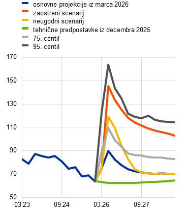 Gospodarstvo v euroobmočju je leta 2025 ostalo odporno kljub negotovosti in šokom zaradi trgovinskih politik. Pričakovanja o rasti so se tekom lanskega leta vztrajno popravljala navzgor, gospodarstvo pa je pozitivni zagon večinoma ohranilo tudi na začetku leta 2026. Vendar se je zaradi vojne na Bližnjem vzhodu negotovost ponovno okrepila in gospodarski obeti so se spet poslabšali. Motnje v ladijskem prometu skozi Hormuško ožino, ki je ključna pot za svetovno trgovino z nafto in utekočinjenim zemeljskim plinom, so skupaj z napadi na energetsko infrastrukturo povzročile precejšnjo volatilnost na svetovnih energetskih trgih in zvišanje cen nafte in plina. Osnovne projekcije so pogojene z gibanjem terminskih cen energetskih surovin na presečni datum (11. marec 2026).[1] Iz projekcij izhaja, da bodo četrtletne povprečne cene nafte in plina dosegle najvišjo vrednost na ravni okoli 90 USD za sod oziroma 50 EUR/MWh v drugem četrtletju 2026, zatem pa se bodo v naslednjih četrtletjih zniževale. V skladu s temi predpostavkami se bo po osnovnih projekcijah inflacija okrepila, zato se bo zmanjšala kupna moč, zasebna potrošnja in s tem tudi rast BDP, zlasti kratkoročno. Vseeno pa prihodnji potek konflikta, njegov vpliv na cene energentov, negotovost in zaupanje ter prenos energetskega cenovnega šoka na cene življenjskih potrebščin razen energentov ostajajo zelo negotovi. Zato so osnovne projekcije dopolnjene z alternativnima, hipotetičnema scenarijema, v katerih se predpostavlja različna intenzivnost gospodarskih posledic konflikta za euroobmočje.