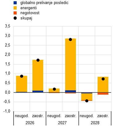 V zaostrenem scenariju se predpostavlja, da bodo imele cene energentov večji in dolgotrajnejši vpliv, spremlja pa jih povečana negotovost. Realna rast BDP je v letih 2026 in 2027 nižja za 0,5 oziroma 0,4 odstotne točke, pri čemer je četrtletna stopnja rasti negativna v drugem in tretjem četrtletju 2026 (graf 14, slika a). Medtem ko ostaja energetski šok glavni dejavnik, ima določeno vlogo tudi negotovost, ki skupaj z globalnim prelivanjem posledic krepi upad. Inflacija je v letu 2026 višja za 1,8 odstotne točke in ostaja povišana, in sicer za 2,8 odstotne točke nad osnovno projekcijo v letu 2027 in za 0,7 odstotne točke nad osnovno projekcijo v letu 2028. Vpliv na inflacijo brez energentov in hrane je večji kot po neugodnem scenariju, in sicer za več kot 1 odstotno točko v letih 2027–2028.