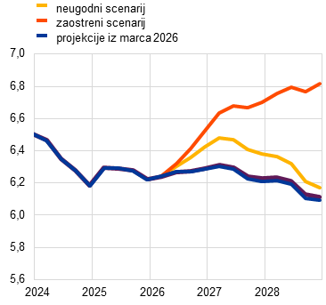 Strokovnjaki ECB so poleg osnovnih projekcij pripravili tudi alternativna, hipotetična scenarija, ki se razlikujeta po predpostavkah o velikosti in vztrajnosti energetskega cenovnega šoka, o njegovem vplivu na mednarodno okolje in negotovost ter o širjenju tega šoka prek posrednih in sekundarnih učinkov na inflacijo. Scenarija ponazarjata alternativna gibanja cen energetskih surovin in njihovo transmisijo v gospodarstvo euroobmočja. Strokovnjaki scenarijema ne pripisujejo stopnje verjetnosti – ampak z njima izpostavljajo glavne negotovosti glede posledic konflikta. Kot je običajno v projekcijah, ta scenarija ponazarjata vpliv na gospodarstvo euroobmočja pod predpostavko, da odziv denarne ali javnofinančne politike ni obsežnejši od odziva, vključenega v osnovne projekcije. Neugodni scenarij vključuje močnejše posredne in sekundarne učinke kot osnovne projekcije, da bi zajel morebitne nelinearnosti pri širjenju začetnega energetskega cenovnega šoka na druge cene v celotnem gospodarstvu. V njem se predpostavlja veliko bolj strmo zvišanje cen energentov ter povečanje negotovosti in obsežnejše prelivanje negativnih posledic v mednarodnem okolju (npr. zmanjšanje zunanjega povpraševanja). Predpostavlja se, da bodo cene nafte in plina v drugem četrtletju 2026 dosegle najvišjo vrednost na ravni 119 USD za sod oziroma 87 EUR/MWh, zatem pa se bodo do tretjega četrtletja 2027 približale osnovnim predpostavkam. Neugodni scenarij v primerjavi z osnovnimi projekcijami nakazuje, da bi bila inflacija v letu 2026 višja za 0,9 odstotne točke in v letu 2027 za 0,1 odstotne točke, v letu 2028 pa bi bila za 0,5 odstotne točke nižja zaradi dezinflacijskih pritiskov, ki izhajajo iz hitre normalizacije cen energentov v tistem letu. Nasprotno bi bila gospodarska rast v letih 2026 in 2027 nižja kot v osnovnih projekcijah, v letu 2028 pa višja. Zaostreni scenarij v primerjavi z neugodnim scenarijem predpostavlja močnejši in vztrajnejši energetski cenovni šok, večjo negotovost ter še močnejše posredne in sekundarne učinke. Predpostavlja se, da bodo v drugem četrtletju 2026 cene nafte dosegle najvišjo vrednost na ravni 145 USD za sod in cene plina na ravni 106 EUR/MWh, zatem pa se bodo zniževale veliko počasneje in bodo v preostanku obdobja projekcij ostale precej višje od predpostavk v osnovnih projekcijah in neugodnem scenariju. V primerjavi z osnovnimi projekcijami bi bila skupna inflacija v obdobju projekcij znatno in vztrajno višja (za 1,8 odstotne točke v letu 2026, 2,8 odstotne točke v letu 2027 in 0,7 odstotne točke v letu 2028). Precejšnja razlika v inflaciji v letu 2028 med neugodnim (1,6%) in zaostrenim scenarijem (2,8%), kot je prikazano v tabeli 1, kaže na ključno vlogo, ki jo imajo potek konflikta, motnje v oskrbi z energijo in velikost mehanizmov širjenja zaradi šoka pri ugotavljanju vpliva na inflacijo v srednjeročnem obdobju. Gospodarska rast bi bila v obdobju 2026–2027 nižja za 0,4–0,5 odstotne točke, nato pa bi se leta 2028 zvišala na raven, ki je 0,5 odstotne točke višja od ravni v osnovnih projekcijah. Zvišanje rasti proti koncu obdobja projekcij odraža predpostavljeno povečanje dohodka in povpraševanja zaradi zvišanja plač v odziv na porast inflacije v predhodnih letih.