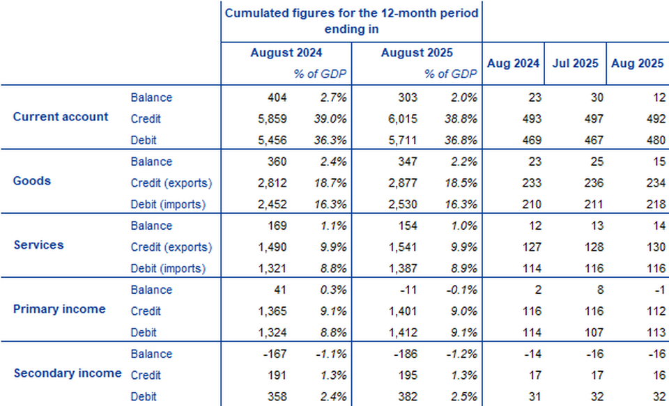 - Current account surplus amounted to €303 billion (2.0% of euro area GDP) in the 12 months to August 2025, down from €404 billion (2.7%) one year earlier