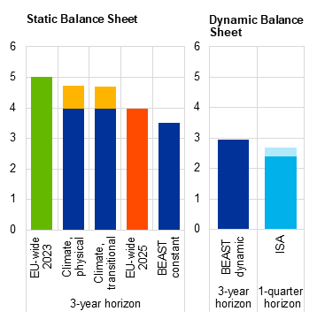 Notes: Panel a: depletion is expressed as CET1 transitional ratio depletion. Simulation results are presented for constant and dynamic balance sheet approaches separately, with the stress horizon specified underneath. “Climate, physical” and “Climate, transition” losses can be considered as additional risks and are presented as an addition to the EBA stress test depletion (yellow bars). For the banking euro area stress test (BEAST) simulations, the constant balance sheet exercise removes a number of EBA’s methodological assumptions, while the BEAST dynamic simulation allows banks to deleverage and derisk. For the system-wide stress test (ISA) losses, first and second-round effects are identified separately (turquoise and light turquoise bars). Panel b: depletion is expressed as CET1 transitional ratio depletion. physical and transition risks are presented jointly under “Climate risks” by taking the maximum depletion from each module for each bank. Only the second-round system-wide stress test losses that capture contagion risks from non-banks are presented. Finally, only the differences between the EBA results and the BEAST constant and dynamic balance sheet simulations are included.