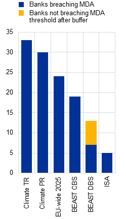 While depletion is comparable across exercises, there are differences in the most vulnerable banks and the number of banks breaching the maximum distributable amount (MDA) threshold. Comparing the share of risk-weighted assets held by banks in the bottom 20th percentile of the depletion distribution reveals that smaller banks are more severely affected under the EU-wide stress test (Chart 2, panel b, first bar). In the ISA simulations, it is instead larger banks that are more affected, owing to their larger exposure to NBFI entities, second-round effects and the different time horizons characterising each simulation.[9] The number of banks breaching the MDA threshold also varies across simulations. It is highest in exercises that incorporate climate losses in addition to the EU-wide losses (Chart 2, panel c). Under the dynamic balance sheet simulations, however, fewer banks breach the MDA threshold, with further reductions observed when available buffers are released (yellow bar).