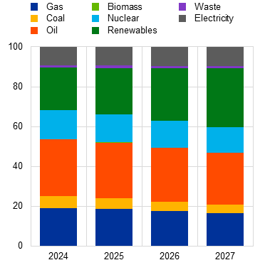 Building on the NGFS NDCs scenario, a short-term transition risk scenario is constructed, reflecting pledged emissions targets and delayed policy action. While climate risk scenarios are typically designed with a long-term horizon, transition risks can also be highly relevant in the short term. This article adopts a short-term perspective on climate transition risk using the 2025-27 path of the NGFS NDCs scenario. This incorporates all pledged emission reduction targets announced by individual countries as of March 2024, even where they have not yet been accompanied by effective policies.[3] Specifically, the NGFS NDCs scenario foresees a shift in the EU energy mix, marked by a reduction in the consumption of fossil fuels such as gas and coal and growing reliance on renewables and electricity, driven by firm-level green investments. Out to 2027, the share of gas, coal and oil in the energy mix is projected to decrease, while renewables are expected to experience a substantial increase, reflecting the transition towards cleaner energy sources (Chart 1, panel a).