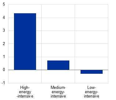The increase in PD over the three-year horizon is more pronounced for firms operating in high energy-intensive sectors. On average, firms’ PDs rise by 50%, with the largest share of the increase concentrated in the first year of the stressed period (Chart 3, panel a). Sectors with high energy intensity face the most substantial increase, with default probabilities climbing by a median of 91%, while firms in medium energy-intensity sectors show a more moderate median rise of 28% (Chart 3, panel b).