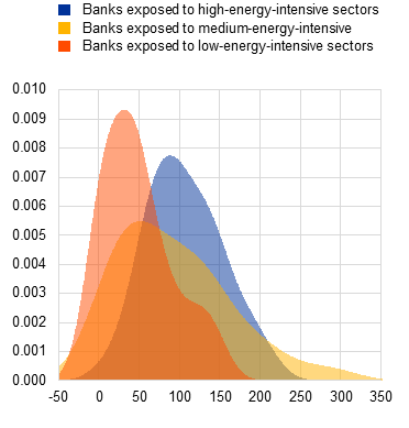 Notes: Panel a) shows the distribution of NFC credit risk losses under the EBA’s adverse scenario with additional transition risk shocks. ST2025 stands for the 2025 EU-wide stress test. Panel b) shows a kernel density of the distribution of the incremental loan losses of transition risk on NFCs under the EBA’s adverse scenario by exposure to sectors with different energy intensity. Banks are ranked by exposure to high, medium and low energy-intensive sectors. The blue, yellow and orange areas show the distribution of the impact for banks with the highest exposure to each of these in order.