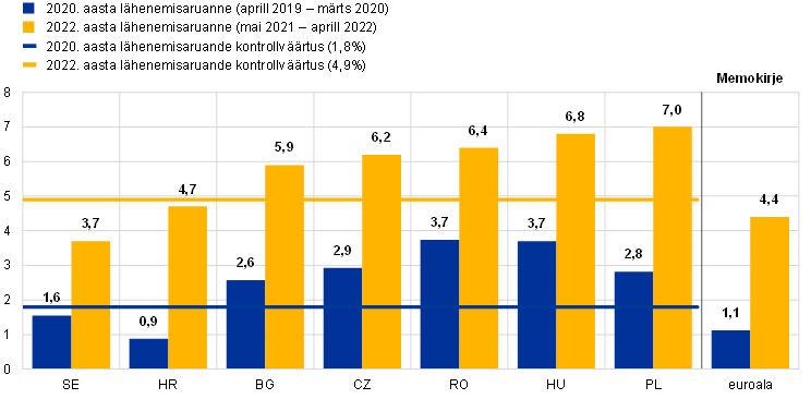 Malta ja Portugali inflatsioonimäär on kontrollväärtuse arvutamisel välja jäetud. Vaatlusperioodil aset leidnud hindade arengu tulemusel oli 12 kuu keskmine inflatsioonimäär neis riikides 2022. aasta aprillis vastavalt 2,1% ja 2,6%. Nende kahe riigi tulemust on kontrollväärtuse arvutamisel käsitletud nn võõrväärtusena, sest mõlema riigi inflatsioonimäär oli vaatlusperioodil märkimisväärselt madalam kui võrreldavad inflatsioonimäärad teistes liikmesriikides ning see tulenes mõlemas riigis erakorralistest teguritest. Inflatsiooni tagasihoidlik areng Maltal kajastas suuresti stabiilseid energiahindu, mis tulenesid valitsuse rahalisest toetusest riigile kuuluvale energiaettevõtjale, kütuseaktsiisi vähendamisest ja indeksi arvutamisega seotud tehnilistest teguritest. Eelkõige muutus 2020. aastal tunduvalt kodumajapidamiste ostukorv, kuigi see oli COVID-19 pandeemiast tingitud ajutine mõju, mis tõi 2021. aastal kaasa indeksi teatud alamkomponentide osakaalude suure muutuse. See muster oli iseäranis märkimisväärne teenusehindade inflatsiooni puhul. Portugali inflatsioonidünaamika erineb euroala omast peamiselt seetõttu, et nii teenuse- kui ka energiahindade kasv oli tagasihoidlikum. Neist esimene viitab turismiga seotud teenuste vähenenud nõudluse suuremale mõjule, kuid teine on tingitud rahvusvaheliste naftahindade ja muude energiakulude väiksemal määral ülekandumisest.[8]
