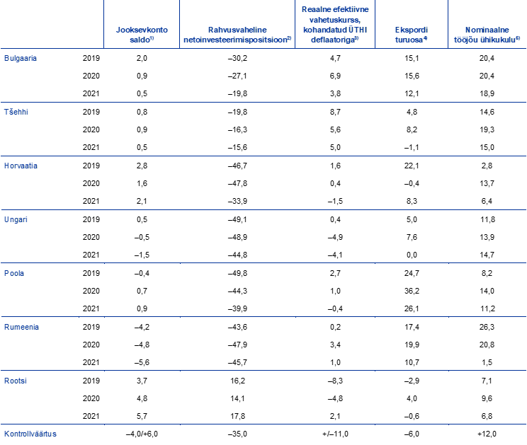 Viimase aja tava kohaselt on aluslepingu artikli 140 lõikes 1 osutatud lisategureid vaadeldud 5. peatükis, kus alapealkirjad vastavad infokastides 1–4 kirjeldatud kriteeriumidele. Täielikkuse huvides on 3. peatükis esitatud kõigi käesoleva aruandega hõlmatud riikide tulemustabeli näitajad (ja nendega seotud häiretasemed), millega tagatakse, et olemas on kogu teave, mis aitab tuvastada makromajanduslikku ja makrorahanduslikku tasakaalustamatust, mis võib takistada vaatlusaluste riikide püsiva lähenemise kõrge taseme saavutamist, nagu on ette nähtud aluslepingu artikli 140 lõikes 1. Seejuures ei saa Euroopa Liidu liikmesriike, kelle kohta kehtib erand ja kelle suhtes on algatatud ülemäärase tasakaalustamatuse menetlus, käsitleda püsiva lähenemise kõrge taseme saavutanud riikidena, nagu on sätestatud aluslepingu artikli 140 lõikes 1.