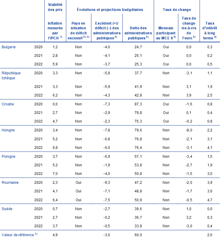 La date limite pour les statistiques figurant dans le présent Rapport sur la convergence était le 25 mai 2022. Les données statistiques utilisées dans le cadre de l’application des critères de convergence sont transmises par la Commission européenne (cf. le chapitre 6 ainsi que les tableaux et graphiques), en coopération avec la BCE en ce qui concerne les taux de change et les taux d’intérêt à long terme. En accord avec la Commission européenne, la période de référence pour le critère de la stabilité des prix comme pour celui des taux d’intérêt à long terme va de mai 2021 à avril 2022. Pour les taux de change, la période de référence va du 26 mai 2020 au 25 mai 2022. Les données historiques se rapportant aux situations budgétaires couvrent la période allant jusqu’à 2021. Il est par ailleurs tenu compte des projections émanant de plusieurs sources, ainsi que du programme de convergence le plus récent de l’État membre concerné et de toute autre information jugée utile pour une analyse prospective du caractère durable de la convergence. Les prévisions économiques du printemps 2022 de la Commission européenne et le rapport 2022 sur le mécanisme d’alerte [7], pris en compte dans le présent Rapport, ont été publiés, respectivement, le 16 mai 2022 et le 24 novembre 2021. Le présent Rapport a été adopté par le Conseil général de la BCE le 27 mai 2022.