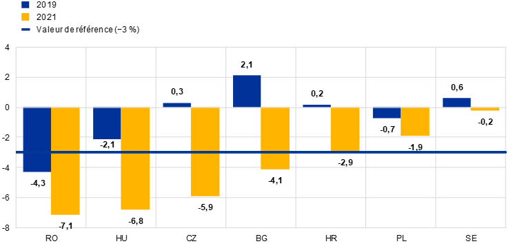 S’agissant du caractère soutenable des finances publiques, les résultats enregistrés pendant l’année de référence, à savoir 2021, sont étudiés en tenant compte des résultats du pays sous revue au cours des dix dernières années. Dans un premier temps, l’évolution du ratio de déficit est analysée. Il convient de garder à l’esprit que la variation du ratio de déficit annuel d’un pays est généralement influencée par plusieurs éléments sous-jacents. Une distinction peut être opérée entre les « effets conjoncturels », qui traduisent la réaction des déficits aux variations du cycle économique, d’une part, et les « effets non conjoncturels », qui reflètent souvent des ajustements structurels ou permanents des politiques budgétaires, d’autre part. Toutefois, les effets non conjoncturels mesurés dans le présent Rapport ne sont pas nécessairement liés dans leur intégralité à une modification structurelle des situations budgétaires, car ils incluent des effets temporaires sur le solde budgétaire résultant de l’incidence de mesures de politique économique et de facteurs spéciaux. En effet, l’évaluation de la manière dont les positions budgétaires structurelles ont évolué durant la pandémie de COVID-19 s’avère particulièrement difficile étant donné l’incertitude entourant le niveau et le taux de croissance du PIB potentiel.