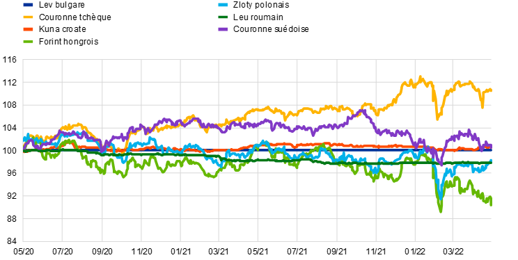 La période de référence retenue dans le présent Rapport s’étend du 26 mai 2020 au 25 mai 2022. Tous les taux de change bilatéraux utilisés sont les taux de référence officiels de la BCE (cf. chapitre 6).