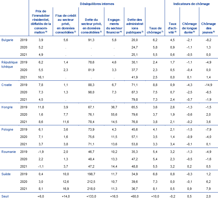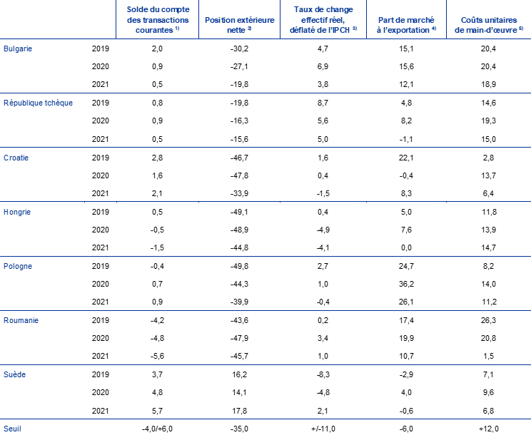 Conformément à la pratique antérieure, les facteurs supplémentaires visés à l’article 140, paragraphe 1, du Traité sont passés en revue au chapitre 5, dans les sections traitant des critères individuels décrits dans les encadrés 1 à 4. Dans un souci d’exhaustivité, le chapitre 3 présente les indicateurs du tableau de bord pour tous les pays examinés dans le présent Rapport (notamment en ce qui concerne les seuils d’alerte), garantissant ainsi l’apport de toutes les informations disponibles pertinentes pour la détection des déséquilibres macroéconomiques et macrofinanciers susceptibles d’entraver la réalisation d’un degré élevé de convergence durable, comme le dispose l’article 140, paragraphe 1, du Traité. En particulier, les États membres de l’UE bénéficiant d’une dérogation qui font l’objet d’une procédure concernant les déséquilibres excessifs peuvent difficilement être considérés comme ayant réalisé un degré élevé de convergence durable au sens de l’article 140, paragraphe 1, du Traité.