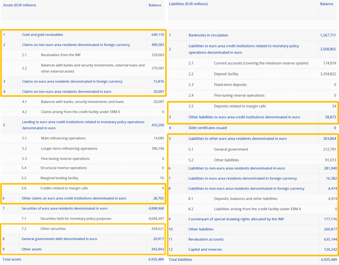 Lo schema mostra che le NFA comprendono le voci 1-4, 5.6, 6, 7.2, 8 e 9 dell’attivo e le voci 2.5 e 3-12 del passivo. Sottraendo dalla somma di queste attività il totale delle passività indicate (ossia le voci incluse nei riquadri in giallo dello schema seguente) si ottengono le attività finanziarie nette dell’Eurosistema.
