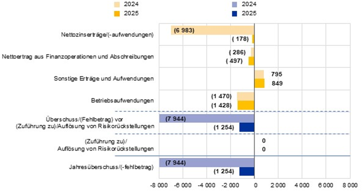 Der Verlust der EZB belief sich 2025 auf 1 254 Mio. €, im Vergleich zu einem Verlust von 7 944 Mio. € im Jahr 2024. Nach einem Beschluss des EZB-Rats wird dieser Fehlbetrag in der Bilanz der EZB als Verlustvortrag ausgewiesen und mit künftigen Überschüssen verrechnet.