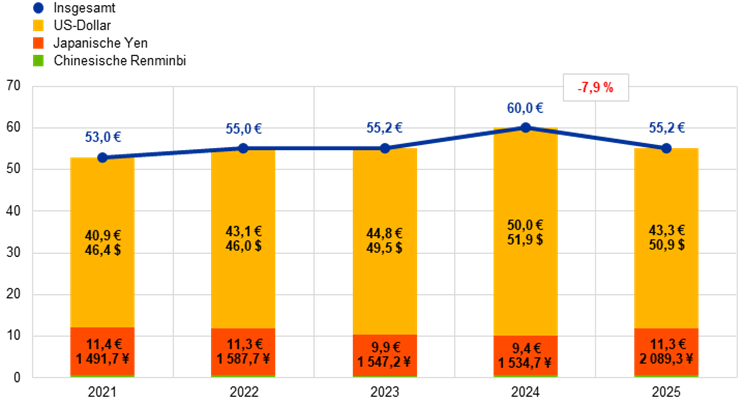 Die Fremdwährungsbestände[15] der EZB in US-Dollar, japanischen Yen und chinesischen Renminbi gingen 2025 in Euro um 4,8 Mrd. € auf 55,2 Mrd. € zurück (siehe Abbildung 5). Hauptgrund war die Abwertung des US-Dollar und des japanischen Yen gegenüber dem Euro. Die Abwertung des US-Dollar spiegelt sich auch in den gesunkenen Salden der Ausgleichsposten aus Neubewertung der EZB wider (siehe Abschnitt 1.3.2 „Nettoeigenkapital“). Gleichzeitig führte die Abwertung des japanischen Yen zu einer in der Gewinn- und Verlustrechnung zum Jahresende ausgewiesenen Wechselkursabschreibung. Grund dafür war, dass die entsprechenden Ausgleichsposten aus Neubewertung 2024 vollständig aufgebraucht worden waren (siehe Abschnitt 1.3.3 „Gewinn- und Verlustrechnung“). Trotz dieser Abschreibung erhöhte sich der Bestand an japanischen Yen infolge einer standardmäßigen Neugewichtung. Diese hatte das Ziel, die Zusammensetzung der Währungsreserven der EZB an die Zielallokation anzupassen. Im Rahmen dieser Neugewichtung veräußerte die EZB im ersten Quartal 2025 einen kleinen Teil ihrer US-Dollar-Bestände und reinvestierte die Erträge vollständig in japanische Yen.