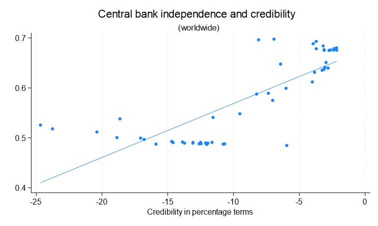 Chart 1 shows a positive correlation between independence and credibility. Put simply, this suggests that more independent central banks are more credible.