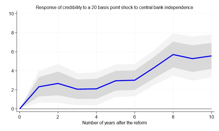 The results show that independence is indeed causal for credibility (see Chart 2). An increase in the independence index of 20 basis points – the average historical change from the worldwide reforms carried out between 1990 and 2020 – leads to a persistent increase in credibility by 6% after ten years.