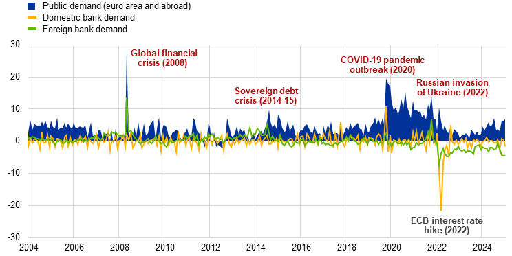 The sustained demand for banknotes has been amplified by sharp increases in public demand during major crises, which highlights the unique role and attributes of physical currency.[1] As illustrated in Chart 1, panel b, monthly net issuance data can be decomposed into public demand, domestic bank demand (“vault cash”), and foreign bank demand (“net shipments”). The public’s additional demand for cash is usually moderately positive. However, the onset of sudden crises – such as the 2008 financial turmoil, the 2014-15 sovereign debt crisis in Greece, the outbreak of the COVID-19 pandemic or Russia’s unjustified full-scale invasion of Ukraine in 2022 – triggered immediate and extreme surges in cash acquisition by the public. Foreign bank demand, reflecting net shipments from wholesaler banks to clients outside the euro area, also spiked during globally significant events like the 2008 crisis and showed a response to the war in Ukraine.[2] In contrast, domestic bank demand for “vault cash”, which represents a smaller component of total circulation (4%-6%), shows less sensitivity to crisis events, with the notable exception of a spike when the COVID-19 pandemic intensified in Europe in March 2020. Conversely, both domestic and foreign banks show strong responsiveness to monetary policy, as seen by the sharp negative net flows during and after July 2022 when an ECB interest rate hike significantly increased the opportunity cost of holding cash.[3] While public demand also saw a temporary dip during this period, net flows were never negative and it has since resumed its trend, highlighting its less interest-rate-sensitive drivers. A disaggregated view, presented in Chart 2, further illustrates how the scope of these surges varies with the nature of the crisis. Some crises trigger widespread demand increases across most euro area countries, while others have a more concentrated impact that is primarily regional or national.