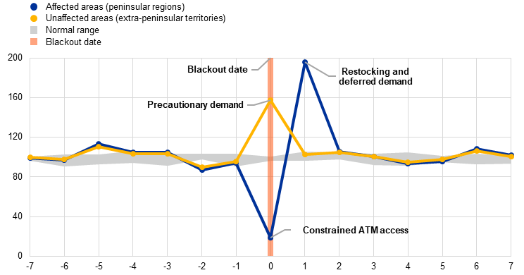 Notes: The chart displays an index of daily ATM withdrawal values (100 = expected normal volume for that day of the week) from over 4,500 Spanish ATMs. The blue line represents areas affected by the blackout (mainland Iberia) and the yellow line unaffected areas (the Balearic and Canary Islands, Ceuta and Melilla). The grey area is the baseline interquartile range (IQR) of typical daily fluctuation. To isolate the impact of the blackout, the “normal” demand baseline is conservatively constructed: it includes comparable historical weekdays, incorporating typical pre-public holiday demand patterns such as those observed around 1 May 2024. This ensures that any surge in 2025 is benchmarked against historically high demand in the run-up to a public holiday, providing a conservative estimate of the distinct effect of the blackout.