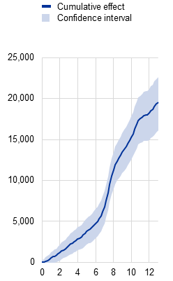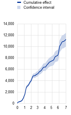 From late 2014 to mid-2015, daily net banknote issuance in Greece was well above the level expected in the absence of the crisis, reflecting elevated public perceptions of risk. Using a causal inference approach with synthetic controls (the Netherlands, Austria and Finland),[17] our analysis shows that the escalation of the crisis had a pronounced and measurable effect on cash demand in Greece. Daily net issuance repeatedly spiked well above the model’s counterfactual estimates (Chart 9, panel a). A particularly sharp peak occurred on 18 June 2015, coinciding with a Eurogroup meeting that did not result in an agreement to release additional funds. On that day alone, net issuance exceeded €300 million. Analysis confirms that all individual spikes are causally attributable to the specific events labelled in Chart 8. For illustrative purposes, we show that over the entire post-intervention period of seven months the average daily net issuance in Greece was approximately €72 million above the expected level.[18] The cumulative effect rose steadily from the moment the crisis started to escalate, reaching an estimated total of €11.2 billion six months later (Chart 9, panel b).