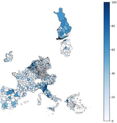 a) Map of municipalities, gradient coloured by share of affected firms in the granular physical risk scenario