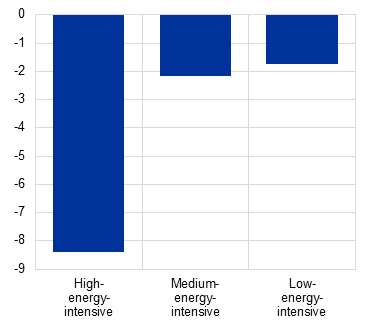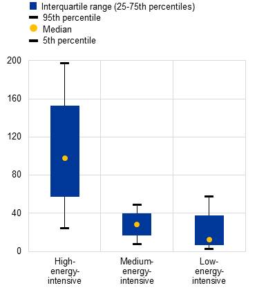 The increase in PD over the three-year horizon is more pronounced for firms operating in high energy-intensive sectors. On average, firms’ PDs rise by 50%, with the largest share of the increase concentrated in the first year of the stressed period (Chart 3, panel a). Sectors with high energy intensity face the most substantial increase, with default probabilities climbing by a median of 91%, while firms in medium energy-intensity sectors show a more moderate median rise of 28% (Chart 3, panel b).