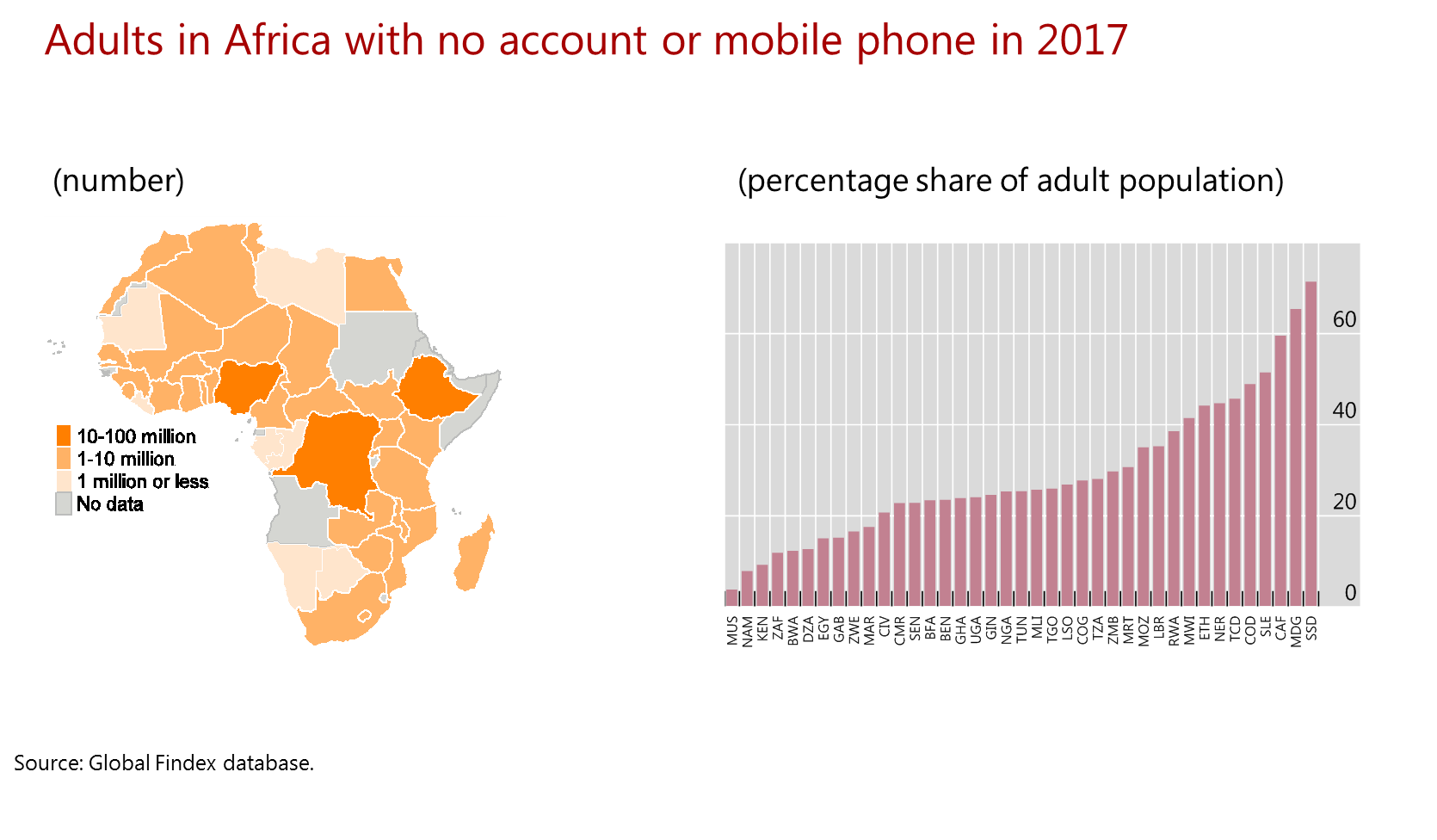 But Chart 1 also highlights another important point – that more work is needed. Only seven African countries have achieved a 60% penetration rate. In many African countries, less than half the population has access to basic payment services. Chart 2 highlights the number of people who have neither a transaction account nor a mobile phone. Expanding payment access through solutions that require a mobile phone is limited to people who have one.