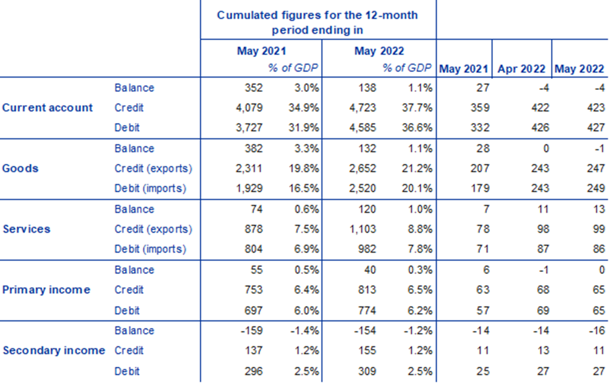 - Current account surplus amounted to €138 billion (1.1% of euro area GDP) in 12 months to May 2022, down from €352 billion (3.0%) one year earlier