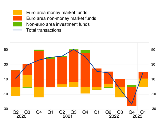 The annual growth rate of euro area money market fund shares held by insurance corporations was 1.0% in the first quarter of 2023, with net purchases in the quarter amounting to €11 billion. As regards holdings of euro area non-money market fund shares, the annual growth rate was 0.4%, with quarterly net purchases amounting to €9 billion. For investment fund shares issued by non-euro area residents, the annual growth rate was 2.0%, with quarterly net purchases close to € 0 billion.