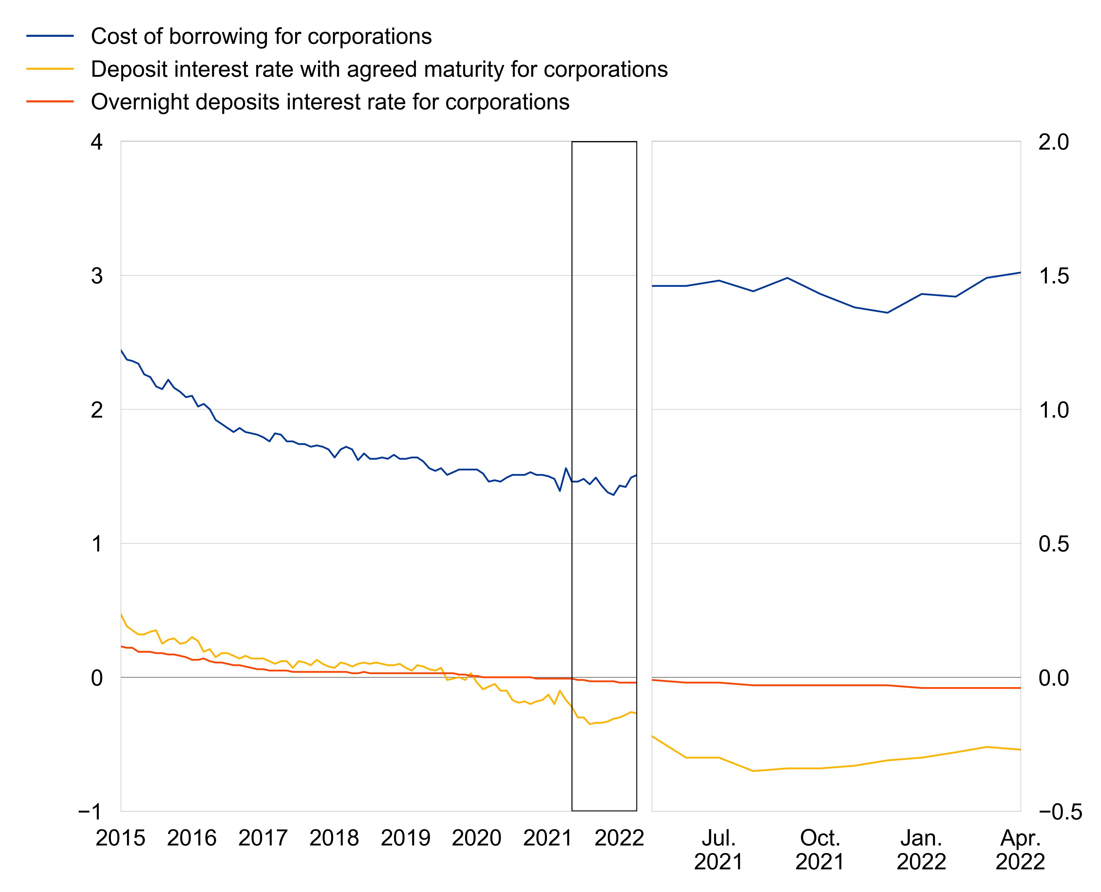 As regards new deposit agreements, the interest rate on deposits from corporations with an agreed maturity of up to one year stayed constant at -0.31% in April 2022. The interest rate on overnight deposits from corporations stayed constant at -0.04%.