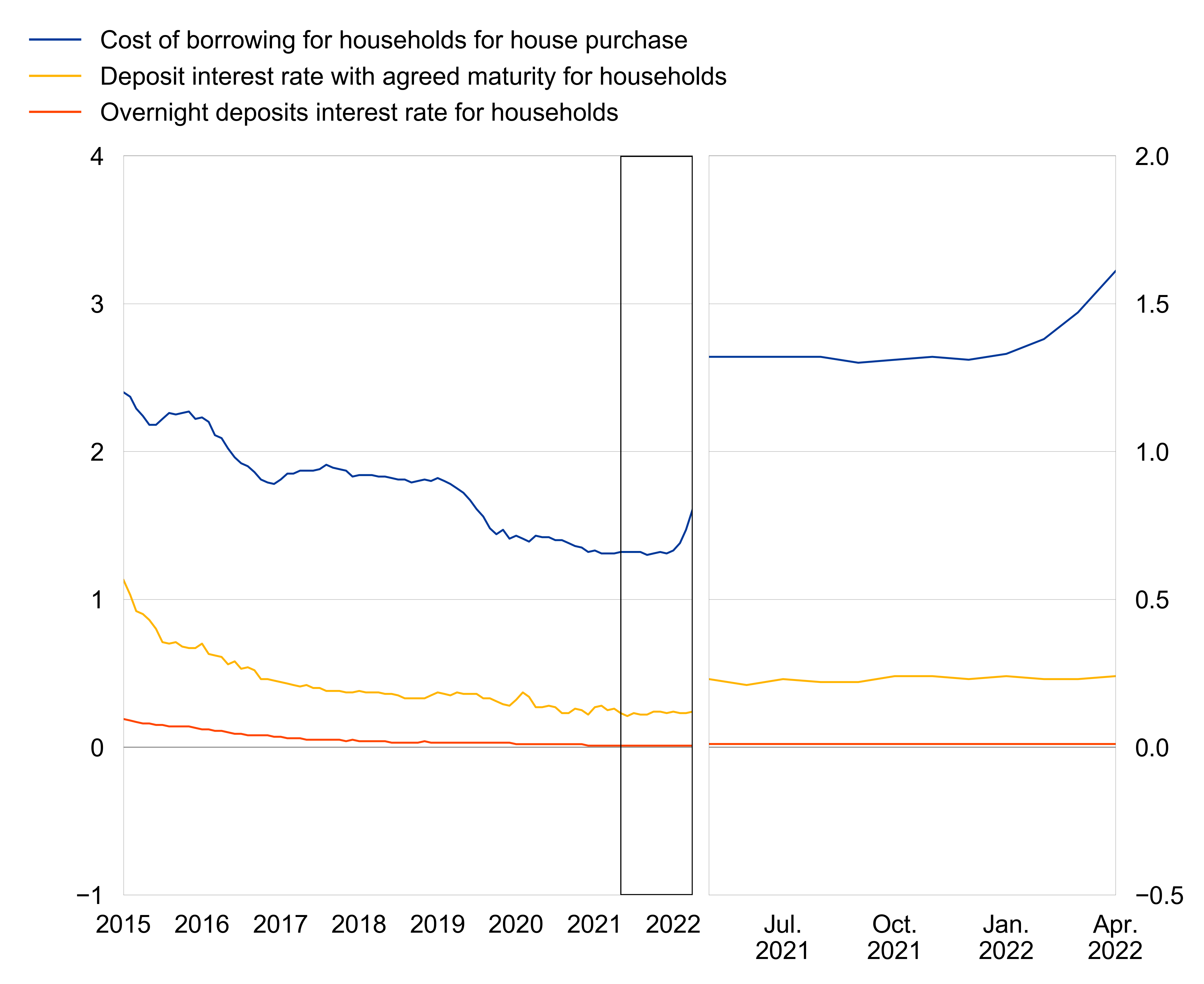 The composite cost-of-borrowing indicator, which combines interest rates on all loans to households for house purchase, increased. This increase was mainly due to developments in one euro area country and was driven by the interest rate effect in April 2022. The interest rate on loans for house purchase with a floating rate and an initial rate fixation period of up to one year remained broadly unchanged at 1.43%. The rate on housing loans with an initial rate fixation period of over one and up to five years rose by 19 basis points to 1.72%. This increase was mainly due to developments in two euro area countries and was mainly driven by the interest rate effect. The interest rate on loans for house purchase with an initial rate fixation period of over five and up to ten years increased by 23 basis points to 1.77%. This increase was due to developments in two euro area countries and was driven by the interest rate effect. The rate on housing loans with an initial rate fixation period of over ten years rose by 11 basis points to 1.58%. This increase was mainly due to developments in one euro area country and was driven by the interest rate effect. In the same period the interest rate on new loans to households for consumption increased by 16 basis points to 5.42%. This increase was mainly due to developments in one euro area country and was driven by the interest rate effect.