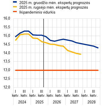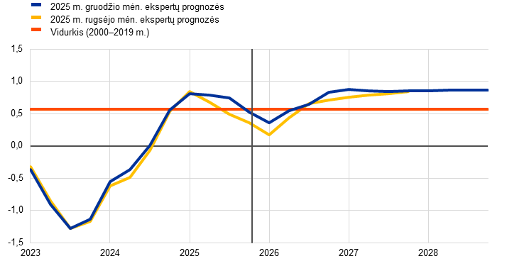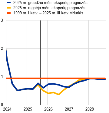 Šaltiniai: EBPO ekonomikos perspektyvos vertinimas, 2025 m. gruodžio 4 d.; Consensus Economics prognozės, 2025 m. gruodžio 11 d. (2027 ir 2028 m. duomenys – iš 2025 m. spalio mėn. apklausos); Europos Komisijos 2025 m. rudens ekonominė prognozė, 2025 m. lapkričio 17 d.; ECB profesionaliųjų prognozuotojų apklausa, 2025 m. spalio 31 d.; TVF pasaulio ekonomikos perspektyvos vertinimas, 2025 m. spalio 14 d.