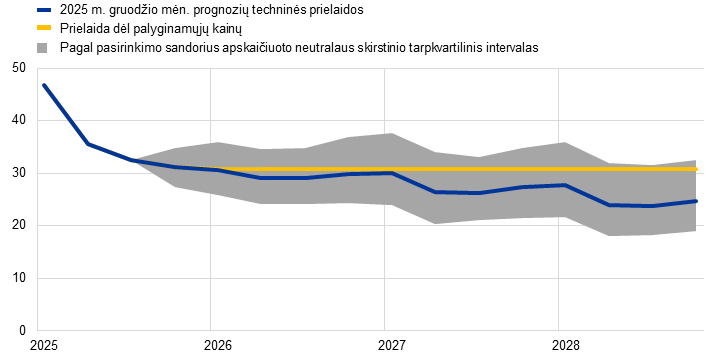 Techninių prielaidų pokyčiai, palyginti su rugsėjo mėn. prognozėmis, apskritai yra nedideli, išskyrus prielaidas dėl energijos ir ATLPS kainų. Prielaidos dėl 2026–2027 m. naftos kainų sumažintos vidutiniškai apie 4 %, dėl didmeninių dujų kainų – 8,6 %, o ateities sandoriais pagrįstos prielaidos dėl ATLPS1 apyvartinių taršos leidimų kainos gerokai – apie 15 % – padidintos. Atsižvelgiant į naujausius pranešimus, dabar daroma prielaida, kad ATLPS2 sistemos įvedimas bus atidėtas vieniems metams iki 2028 m., o prielaida dėl kainos grindžiama Europos Komisijos 2025 m. rudens ekonominėje prognozėje naudota kaina (46 eurai už toną CO2, t. y. gerokai mažesne negu 59 eurai už toną CO2 kainą, dėl kurios 2027 m. dydžio prielaida daryta ankstesnėse Eurosistemos ar ECB ekspertų prognozėse; dėl išsamesnės informacijos žr. 2 intarpą)[6]. Nuo rugsėjo mėn. prognozių euro kursas JAV dolerio atžvilgiu smuktelėjo 0,5 %, o nominalusis efektyvusis kursas – 0,1 %. Prielaidos dėl trumpalaikių palūkanų normų buvo patikslintos tik šiek tiek, o dėl ilgalaikių palūkanų normų tiek 2026 m., tiek 2027 m. sumažintos 0,2 procentinio punkto.