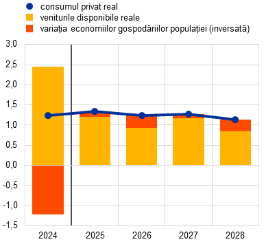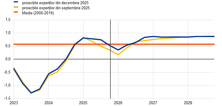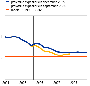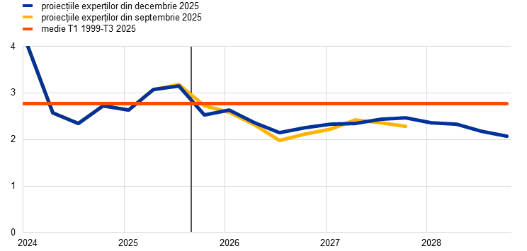 Sursa: OECD Economic Outlook, 4 decembrie 2025, Consensus Economics Forecasts, 11 decembrie 2025 (datele pentru 2027 și 2028 sunt preluate din sondajul realizat în luna octombrie 2025); Previziunile economice ale Comisiei Europene, toamna anului 2025, 17 noiembrie 2025; Sondajul BCE în rândul specialiștilor în prognoză, 31 octombrie 2025; și IMF World Economic Outlook, 14 octombrie 2025.