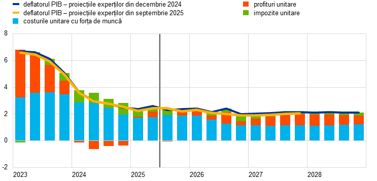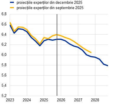 Conform proiecțiilor, inflația se va reduce de la 2,1% în 2025 la 1,9% în 2026 și, ulterior, la 1,8% în 2027, urmând să atingă ținta BCE de 2% pe termen mediu în 2028. Scăderea anticipată a inflației totale (măsurată prin indicele armonizat al prețurilor de consum – IAPC) la începutul anului 2026 reflectă un efect de bază în sensul scăderii generat de prețurile produselor energetice, în timp ce componentele non-energetice ale inflației ar trebui să consemneze în continuare o diminuare pe parcursul anului 2026. Contribuția dinamicii prețurilor produselor energetice la inflația totală ar trebui să rămână modestă până la sfârșitul anului 2027, după care va înregistra o creștere semnificativă în 2028, ca urmare a implementării anticipate a Schemei UE de comercializare a certificatelor de emisii 2 (Emissions Trading System 2 – ETS2), cu un impact în sensul creșterii de 0,2 puncte procentuale asupra inflației totale. Se previzionează că inflația IAPC exclusiv produse energetice se va reduce de la 2,5% în 2025 la 2,2% în 2026 și la 2,0% în 2027 și 2028. Conform proiecțiilor, dinamica prețurilor alimentelor se va diminua considerabil, pe fondul disipării efectelor majorărilor anterioare ale prețurilor materiilor prime alimentare la nivel mondial și ale condițiilor meteorologice nefavorabile din perioada verii, estimându-se o stabilizare a acesteia la ritmuri ușor peste 2% începând cu ultimele luni ale anului 2026. Inflația IAPC exclusiv produse energetice și alimente (IAPCX) se va modera de la 2,4% în 2025 la 2,0% în 2028, în condițiile în care dinamica prețurilor serviciilor se reduce pe fondul atenuării presiunilor din partea costurilor cu forța de muncă, iar aprecierea anterioară a euro se transmite în lanțul de stabilire a prețurilor, determinând scăderea inflației măsurate prin prețurile bunurilor. Dinamica salarială ar trebui să se tempereze în continuare până în 2026, după care se va stabiliza la circa 3%, fiind susținută de o piață rezilientă a forței de muncă și de un avans al productivității ușor sub 1%. Se anticipează o diminuare a ritmului de creștere a costurilor unitare cu forța de muncă, deși se consideră că impactul asupra inflației va fi parțial compensat de redresarea treptată a marjelor de profit pe parcursul orizontului de proiecție. Comparativ cu proiecțiile din luna septembrie 2025, perspectivele inflației IAPC totale au fost revizuite în sens ascendent cu 0,2 puncte procentuale pentru 2026, reflectând datele recente peste așteptări privind inflația IAPC și dinamica salarială, aceasta din urmă conducând la o revizuire semnificativă în sens ascendent a perspectivelor privind câștigurile salariale. Proiecția pentru inflația IAPC a fost revizuită în sens ușor descendent pentru anul 2027 ca urmare a unei contribuții estimate mai scăzute din partea componentei „produse energetice”, întrucât se așteaptă în prezent ca implementarea ETS2 să fie amânată din 2027 în 2028, deși se consideră că această contribuție va fi parțial compensată de o dinamică mai alertă a prețurilor serviciilor.